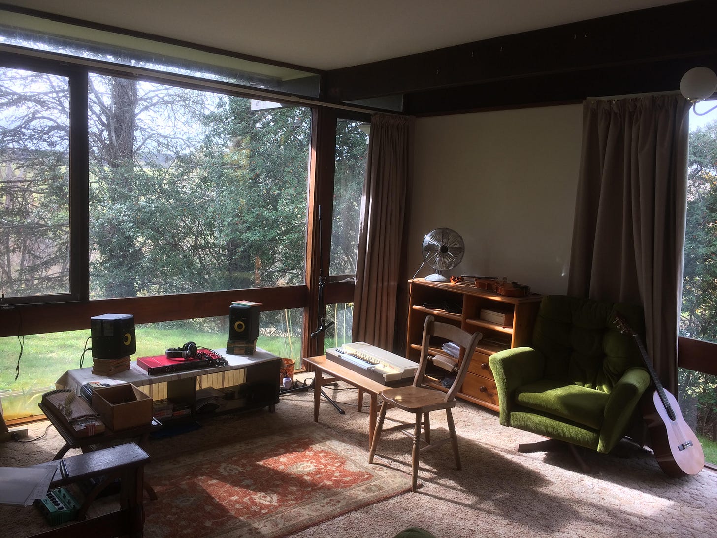 H: I don’t know how you feel about music making, and stuff. But I’ve always seen music as a creature inside me, a little worm. If things are silent, it worms its way up. It says, hey, I can come do something. And then when there’s people around, it says, “no. Fuck you. I’m not coming out.” The worm can only rise if there’s silence enough to listen. People used to say to me, you live in the city, that’s amazing. You should be making so much music. When I was in Melbourne, I did not touch a guitar, a mic, a piano, for a year and two months. Nothing. Not once. I didn’t sing once. I didn’t make anything once. Which was a stark contrast from coming out of a massive creative period…it was so clear it was the fact I had neighbours. Driving into Melbourne, I felt million voices as a wave spill over me. And it just stayed like that until I left.