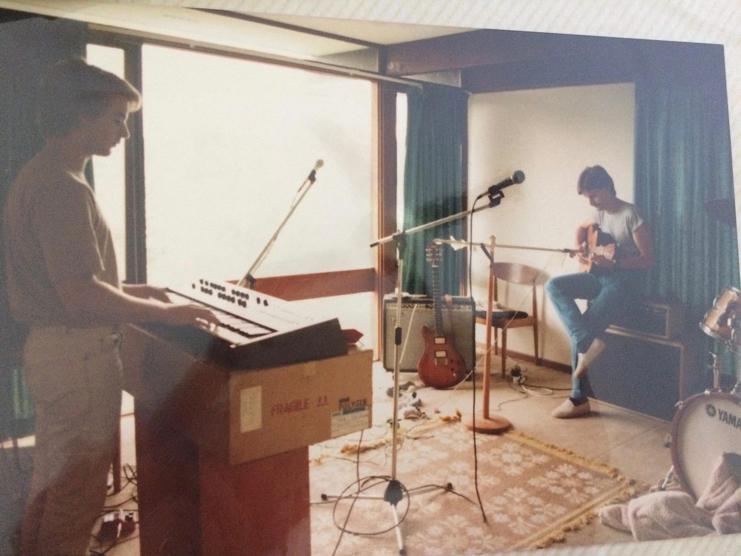 Hana tells me in a subsequent email that this picture is of “my Dad (right) Pip and his brother Jamie. Jamie played in the 80’s band ‘The Mood Section’ and his mullet would be the envy of anyone these days. I made my music in the same room as this one…I found all of Jamie’s old cassettes, heard him at 21 trying out new songs on a 2 track just like I would. And I felt that although he had died young..that he was there in some way; kindred spirits.”